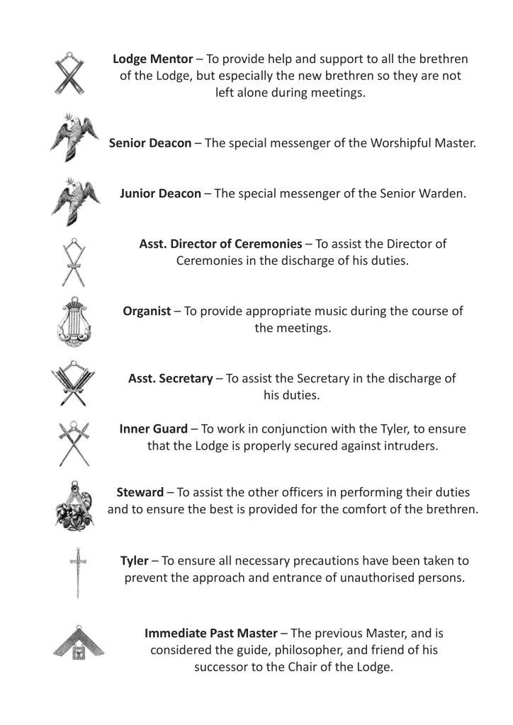 Lodge Mentor – To provide help and support to all the brethren of the Lodge, but especially the new brethren so they are not left alone during meetings.