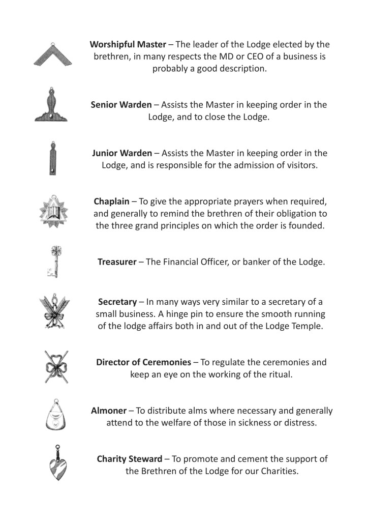 Secretary – In many ways very similar to a secretary of a small business. A hinge pin to ensure the smooth running of the lodge affairs both in and out of the Lodge Temple.